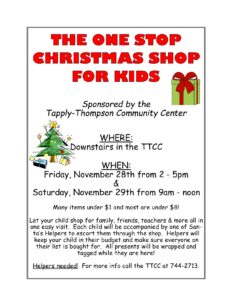 The One-Stop Christmas Shop is a special event that gives children the opportunity to do all their Christmas shopping for family and friends in one convenient location!